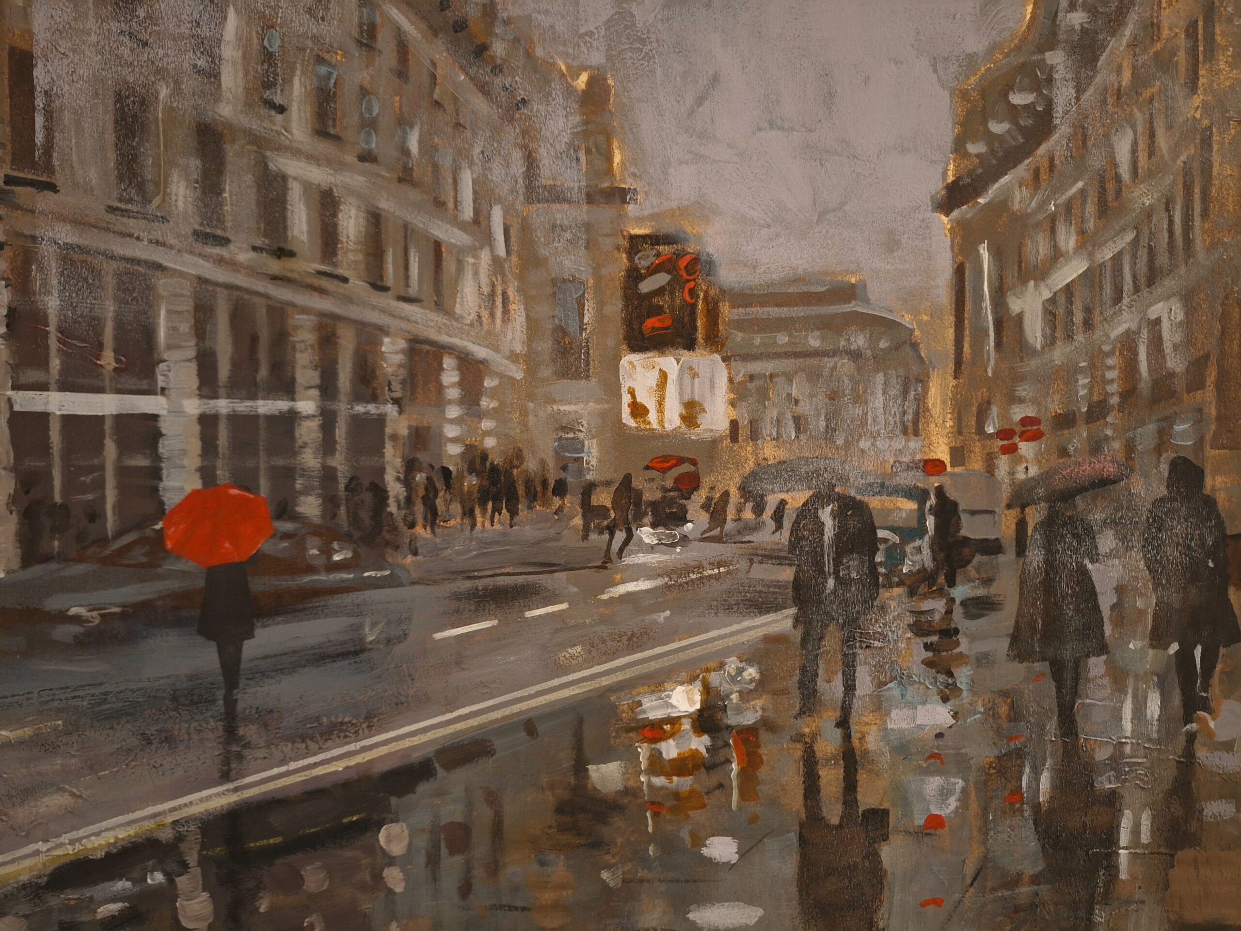 I first met Barry when I organised a Fundraising Gala event held at the Saatchi Gallery for a children’s charity I used to work for – that was over 10 years ago now. He very kindly donated one of his pieces which sold in the auction and raised well over £3K towards the £125K raised on the night. Luckily we kept in touch and now he loans his works for us to display for our guests enjoyment. When you visit, you will see that various pieces are for sale. This latest painting is a London scene on a rainy day, but do you know where?
